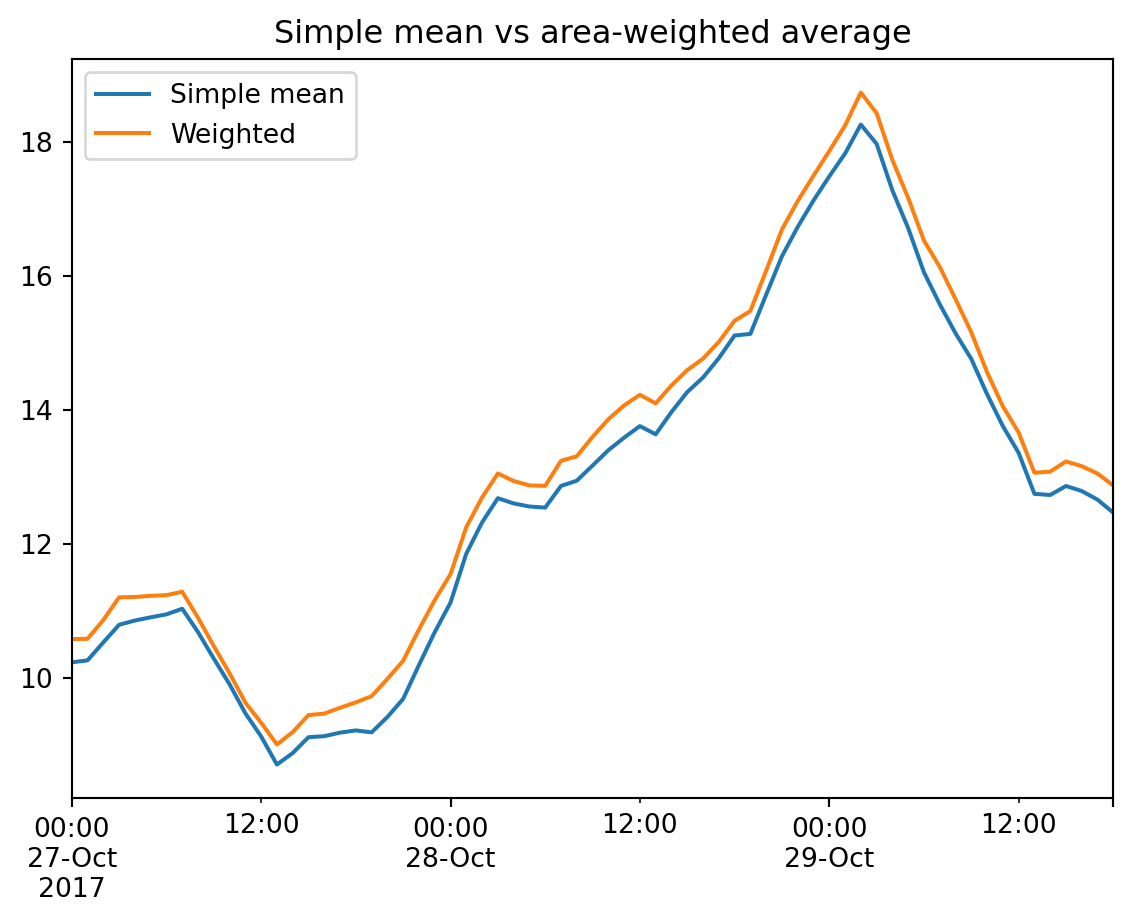 df_compare.plot(title="Simple mean vs area-weighted average");